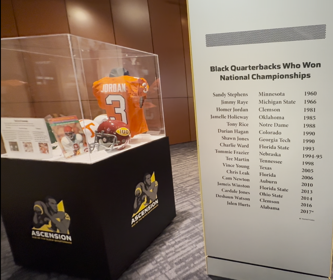 One exhibit slowed all of us down though. Ascension: Rise of the Black Quarterback is newly integrated and naturally draws attention. Through historical artifacts, imagery, and carefully framed context, the exhibit traces how Black quarterbacks challenged entrenched misconceptions and reshaped leadership at the sport’s most demanding position. Alex lingered here longer than I expected, reading names aloud and asking questions, while Joe and I filled in stories we remember watching unfold in real time.